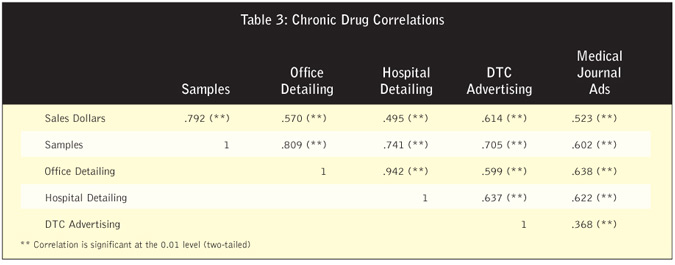 Unlike the acute drugs above, all of the correlations in Table 3 of sales with the promotional mix variables are significant for chronic drugs.
