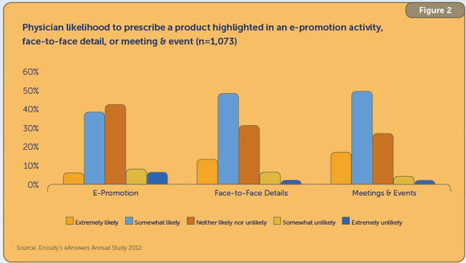 In terms of actually driving prescriptions, e-promotion does lag behind events and face-to-face details. Forty-four percent of physicians surveyed in 2012 are somewhat or extremely likely to prescribe a product highlighted during an e-promotion activity, compared with 45 percent in 2011. By comparison, 67 percent of physicians surveyed in 2012 are somewhat or extremely likely to prescribe a product highlighted at a meeting or event, compared with 61 percent who would do the same for a product highlighted during a face-to-face detail (Figure 2).