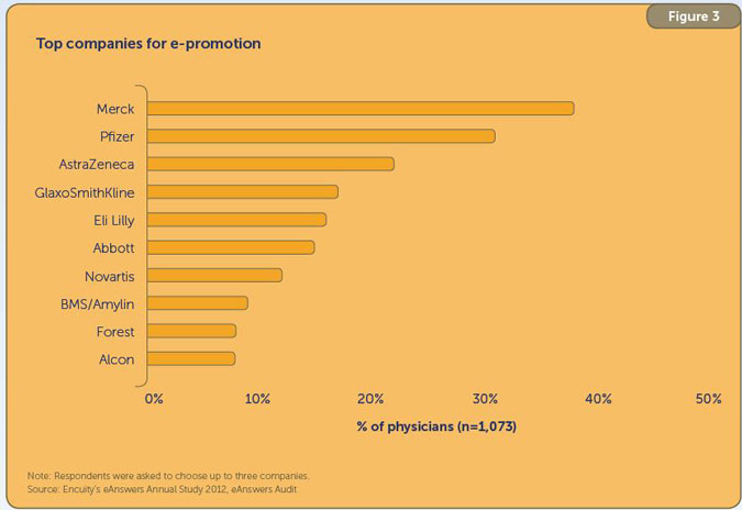 As shown in Figure 3, Merck remained in the top position in 2012, with 38 percent of physicians choosing the company as having the best e-promotion activities. Pfizer was ranked number two.
