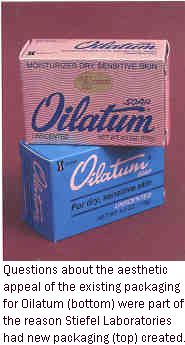 In the Spring of 1990, a research project was undertaken to test two new designs against the existing package. In updating the packaging, Stiefel had to walk a fine line to avoid alienating current users while attracting new ones. "Because such a high percentage of patients use Oilatum over and over again, we didn't want to change the package so drastically that they couldn't find the product on the shelf," Martinolich says.
