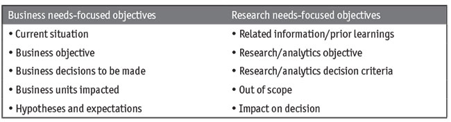 The Smart Insights Brief begins with a look at the business objectives before research is even discussed. For example, you might start with questions such as, “What is the current situation that is triggering the request for research/analysis?” This technique is a good lead-in for probes related to the business objectives (such as improved profitability or increased sales through market extensions) being addressed. Next, dimension is added to the business objective by defining how the information will be used (“decisions to be made”), who in the organization will be affected (and might be brought into study design) and the existing beliefs regarding the possible results. Only when the business objectives are clear is it time to move on to the research needs.