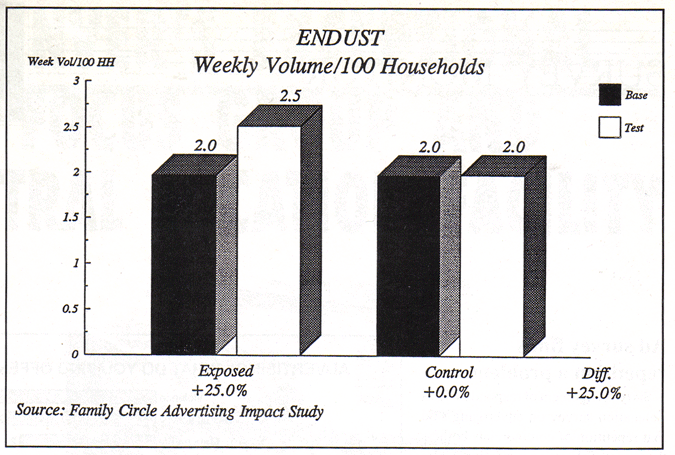 During the 12 weeks before the Endust ad ran in Family Circle, the control and exposed groups bought Endust at the same rate. After the ad ran in Family Circle, the exposed group bought 25% more. During the post period, those who bought Family Circle continued to buy Endust at a 10% higher rate than those in the control group. According to the study report, "There was virtually no change in the Endust purchasing of the control group throughout the 28 week measurement period."