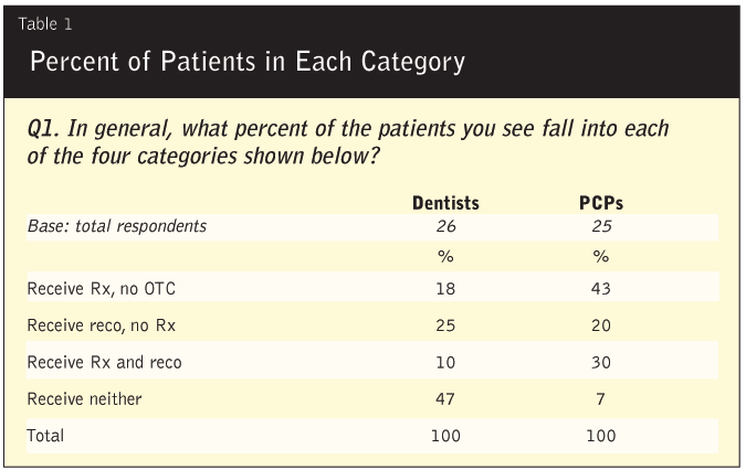 Respondents were asked what percent of their patients fit into the following categories: receive an Rx and no OTC; receive a reco and no Rx; receive both an Rx and reco; and receive neither. Nearly half of dentists’ patients receive no Rx or reco (Table 1). Most patients of PCPs receive an Rx and no OTC. Only 7 percent of patients of PCPs receive no Rx or reco.