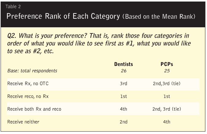 Then, respondents were asked to rank the previous four categories in order by preferred course of action (Table 2). Of the four possibilities both professionals prefer a reco and no Rx. Perhaps this lets the HCP believe they have contributed while generating the least hassle for the patient. Dentists prefer “both Rx and reco” the least; speculation is that they dislike seeing patients in that much trouble. On the other hand, PCPs prefer “neither Rx nor reco” the least. Perhaps they feel they have not done enough if no product is provided.