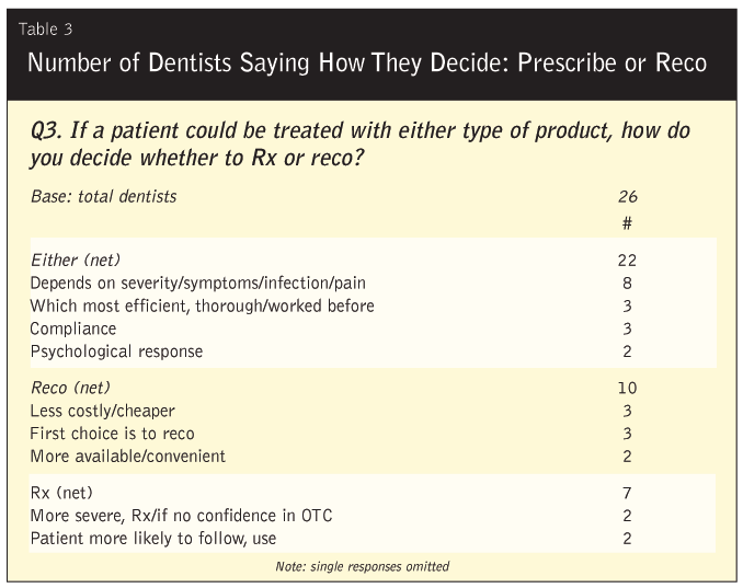 Dentists decide whether to treat their patients with an Rx or reco by severity or degree of pain, cost and convenience of recos for patients versus an Rx, which product does the job most efficiently and which has the best chance of compliance (Table 3).