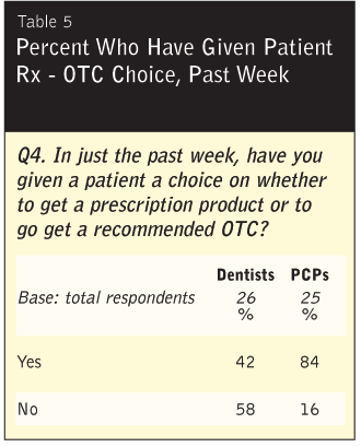 A significantly higher percentage of PCPs than dentists had given their patients a choice between an Rx and reco within the past week, 84 percent to 42 percent, respectively (Table 5).