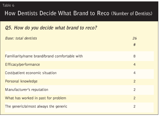 When they decide what brand to recommend, dentists consider brands that they are familiar with, based on efficacy, the patient’s economic situation, the cost and how well the product has worked before (Table 6).