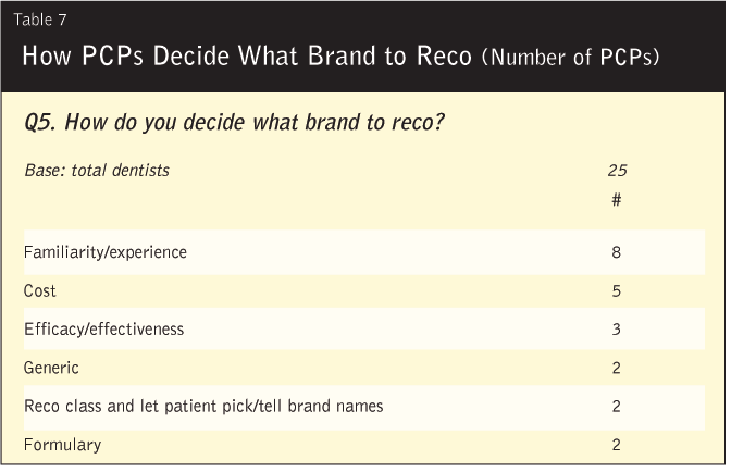 When they decide what brand to recommend, PCPs consider brand familiarity, their experience with the brand, cost, efficacy and the existence of generics (Table 7).