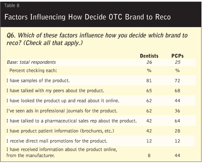 Respondents were shown eight factors and asked if each influenced them at all in determining which brand to recommend. Among dentists, the highest percent selected samples, peers and self online. Among PCPs, the top three choices are samples, peers and pharmaceutical sales reps (Table 8).