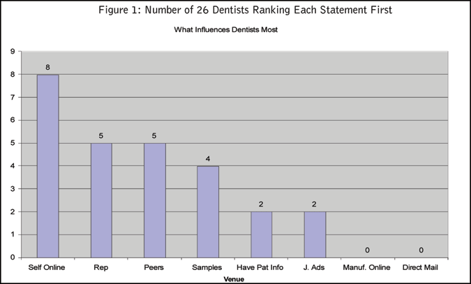 Many of the differences noted between dentists and PCPs were to be expected, such as the lack of prescribing or recommending among dentists. Of greatest interest was the differential role of pharmaceutical sales reps. The dentists see few, and, as a result, the sales representatives’ influence is not all that important in the scheme of things. The PCPs see pharmaceutical sales reps much more often and think the reps are much more important to them.