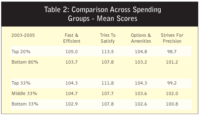 • Of the four loyalty drivers, only one – “tries to satisfy customers” - was a significant determinant of total spending dollars, with a coefficient of 2.27. This means that a 10 percent increase in a customer’s score on that driver will yield a 22.7 percent higher level of spending.