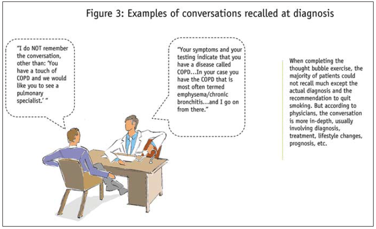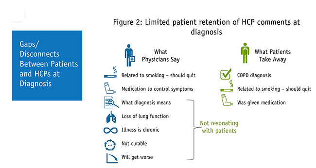 The point of patient diagnosis may be most challenging. With new influxes of information, physicians want to convey as much as possible but patients have intense emotions and feelings; thus, only very little of what the doctor says at diagnosis is actually retained. For example, the study found 92 percent of HCPs recalled recommending patients quit smoking at diagnosis. However, only 64 percent of patients remember the same. The projective thought-bubble exercise also uncovered other details patients don’t recall, such as what the diagnosis means exactly, the fact that the illness is chronic and not curable, and that it will only get worse. Basically, the only aspects patients take away from the visit are the actual diagnosis and that they are given some kind of medication (Figure 2). Other details around treatment and next steps go unrecalled. But again, the importance of seeing a specialist (pulmonologist) results in a higher percentage of satisfied patients and those satisfied are more likely to retain information at diagnosis.