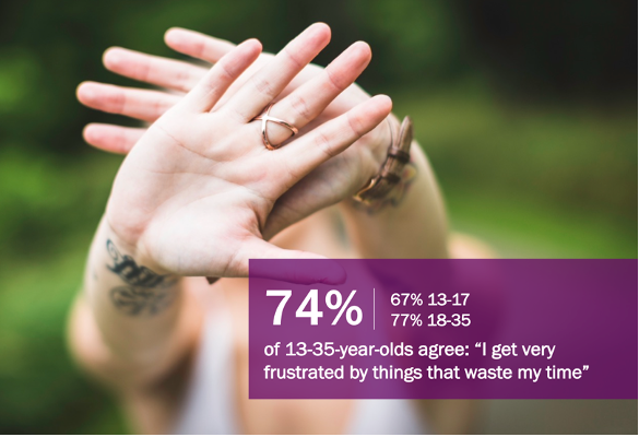 We also see impatience on the rise: 74% of 13-35-year-olds agree with the statement “I get very frustrated by things that waste my time” 48% of 13-to-35-year-olds agree with the statement “I get very frustrated by things that are outdated,” 38% of 13-35-year-olds have cancelled plans because it took too long to get there and 37% of 13-to-35-year-olds agree with the statement, “With all of the technological advances today, I shouldn’t have to do mundane tasks.”