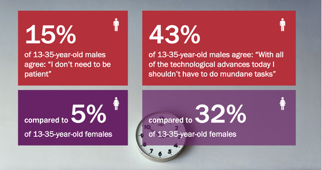 Males are more likely than females to believe that modern advances in technology means patience is no longer required. Many survey researchers struggle to meet quotas for male participation and the secret might well be in the fact that we’re asking more of young male survey participants than they are willing to give.