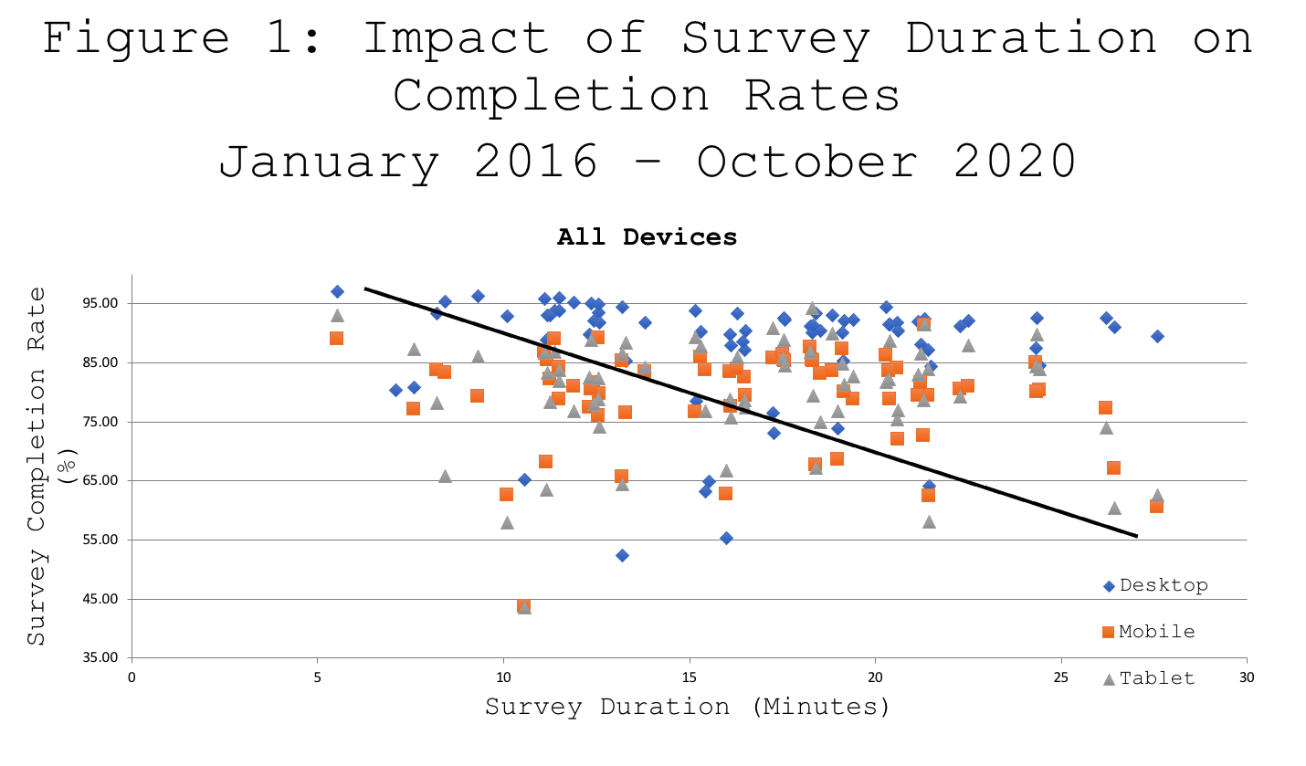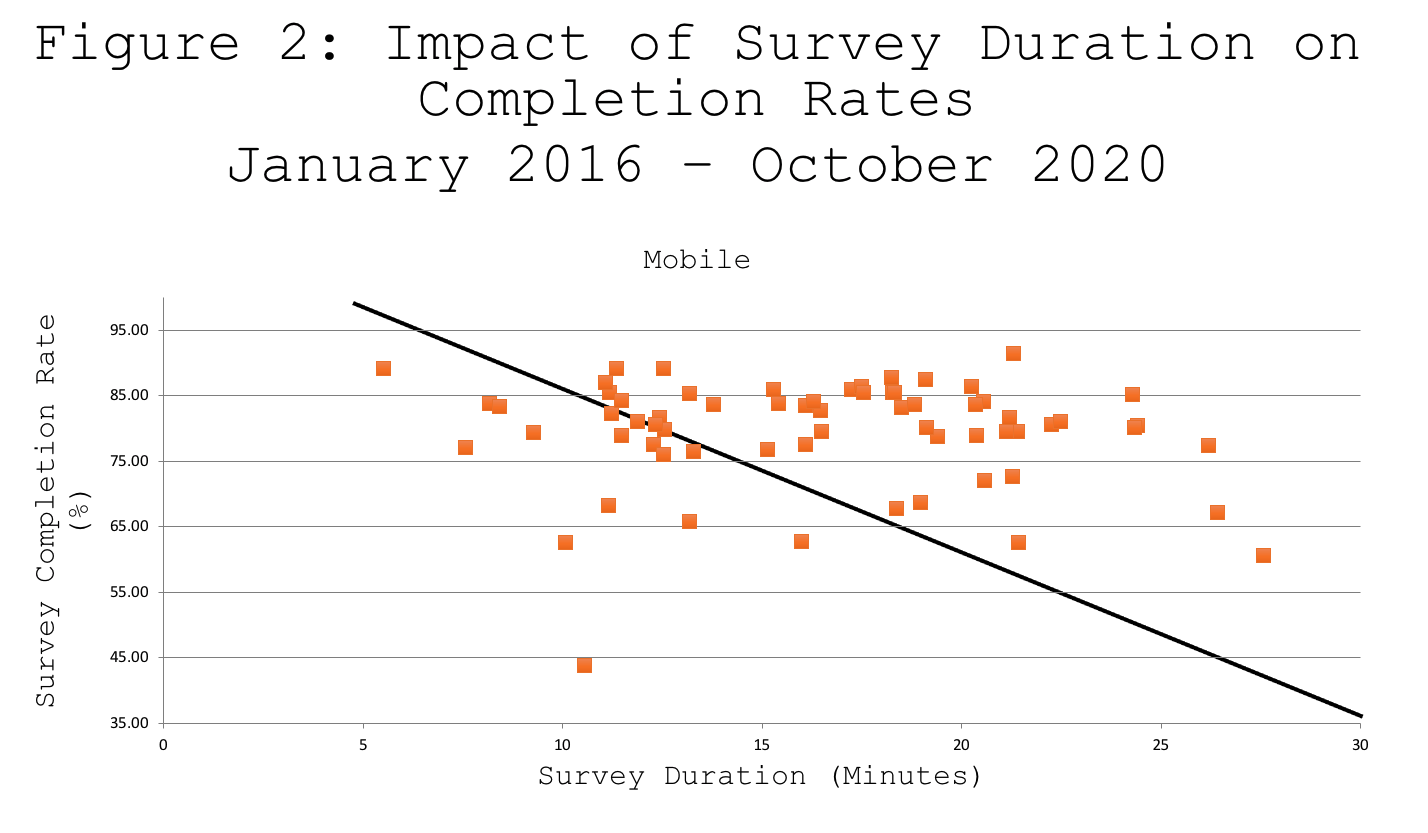 Regardless of the device that the participant uses or sample source, if your goal is to deliver a representative sample, you owe it to yourself (and your clients) to keep your surveys short and sweet. Every minute of duration has an impact on completion rates. While you can indeed administer a 20+ minute survey, you’ll find that you’re interviewing only those who possess atypical dedication and stamina.