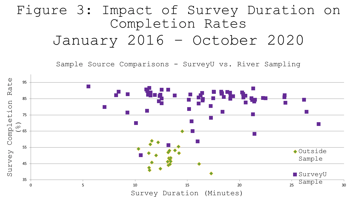 We compared completion rates with survey duration within our bi-monthly syndicated surveys over the last five and a half years in order to show how quickly we can wear out our welcome with young participants. We use a combination of a proprietary youth panel alongside river sampling vendors.