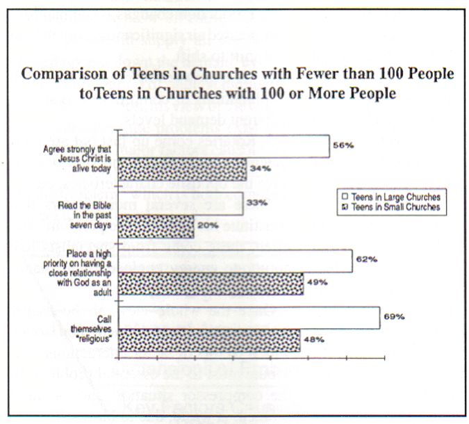 Among the teens from larger churches, 33% read the Bible in the week preceding their interview, and 62% went to church. Among teenagers from smaller churches, only 20% read the Bible in the week before their interview, and only 40% had attended church.