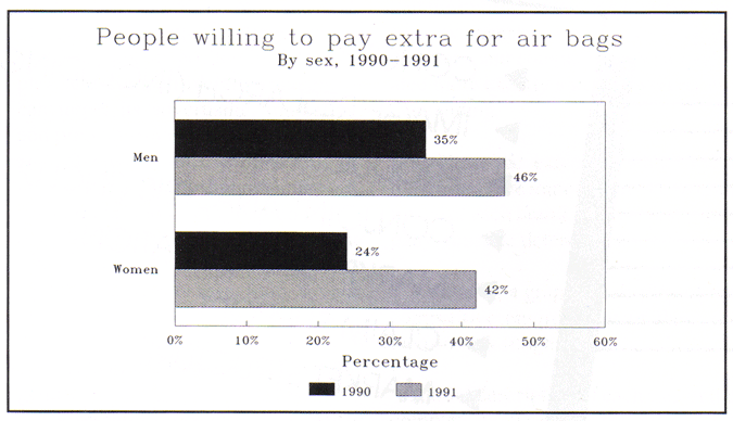 Consumer awareness and acceptance of air bags in automobiles has increased significantly over the past few years, yet many Americans remain nervous about their technological safety, according to a nationwide survey on auto safety in America. The survey, conducted for Prevention magazine and General Motors by Louis Harris and Associates, found that 44 percent of American adults would pay an extra $500 for a car equipped with an air bag, compared to only 29% in 1990.
