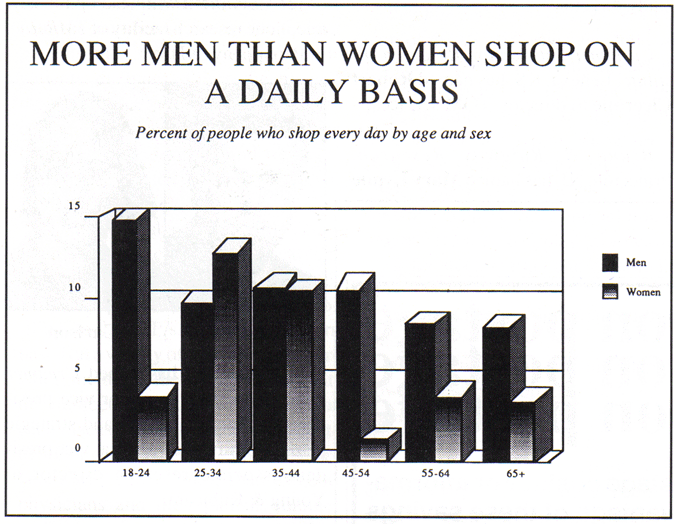 For almost all ages, men shop on a daily basis more often than women. One-fourth of men 18-34 years old shop daily, compared to 17% of women. Similarly, 39% of men 35 or older, and just 20% of women, shop every day. "A possible reason," suggests Beth Nieman, research manager at Maritz, "is that men make shorter, fill-in trips like going to the store for milk, while women consolidate their shopping into longer, less frequent trips."