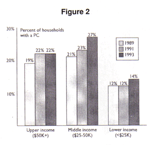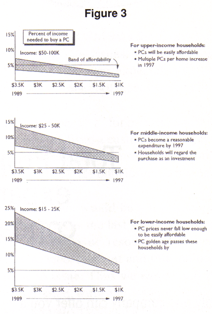 The report also predicts that in 1997 PC makers will encounter problems with extending the market to low-income households. Even though PC prices will be brought down to $1,000, this will not establish a band of affordability for this consumer segment (see Figure 3). "To reach the acceptance levels of VCRs, telephones, and television, major changes in the PC world will be needed," concludes Bluestein. "A universal computer must emerge that is intuitive, simple, low-cost (less than $500), and powerful."