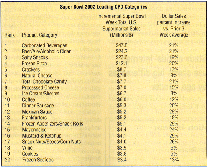 A study by Chicago-based Information Resources, Inc. shows that this year’s Super Bowl was a success overall for consumer packaged goods (CPG) manufacturers and retailers. IRI Pulse: Super Bowl XXXVI, part of a series of ongoing studies around noteworthy trends in the CPG industry, examined supermarket sales of food products during the week leading up to the Super Bowl.