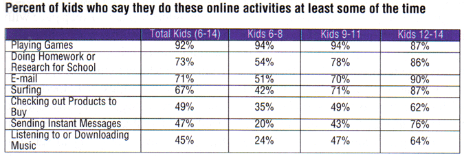 The activities that kids partake in while on the Intemet differ across age groups and gender as well. Younger kids tend to use the Intemet primarily as a source of entertainment in the form of online games. Older kids, however, use the Intemet for a variety of purposes: as a means of communicating with friends, a way to get information, and a source of entertainment. Game-playing dominates kids’ use of the Intemet, among both boys and girls, until about the age of 10 or 11, after which the activity drops off sharply, especially among girls. Seventythree percent of kids between the ages of 6-8 report that their No. 1 use of the Internet is playing online games. Between the ages of 9-11, this figure drops to 43 percent, and by the time kids are 12-14, only 19 percent say that playing games is their primary use of the Internet. Older kids (12-14), especially older girls, are more inclined to use the Internet for e-mail and instant messaging than for playing games. In fact, girls between the ages of 12-14 are twice as likely as their male counterparts to send instant mess ages: 64 percent of girls aged 12-14 reported sending instant messages as compared to only 31 percent of their male counterparts. Finally, while parents may hope that their kids are using the Intemet to conduct research for their homework, only 11 percent of kids indicate that this is their chief use of the Intemet. Nonetheless, nearly three quarters of kids claim to use the Intemet at least"some of the time" for schoolwork.