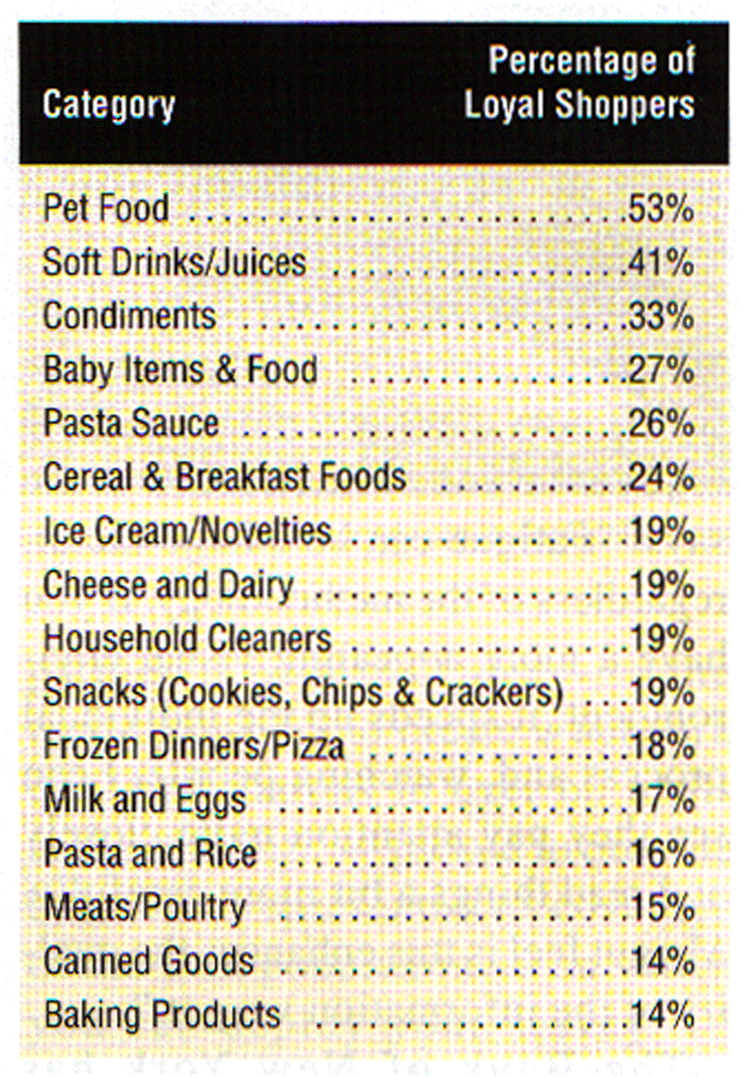Purchasing loyalty on behalf of Fido far exceeds that for baby Junior when it comes to the grocery store, according to a survey of 500 grocery shoppers conducted by InsightExpress, a Stamford, Conn., research company. The survey reveals that Americans report tittle brand loyalty when shopping for themselves or their children in the supermarket, with the most loyalty-inducing products cited by participants being soft drinks at 41 percent and condiments at 33 peBaby food and baby items rated just 27 percent brand loyalty. But when purchasing food for their pets, more than one haft of consumers purchasing pet food (53 percent) say they are more likely to stick with one brand (see chart for loyalty levels by product category).