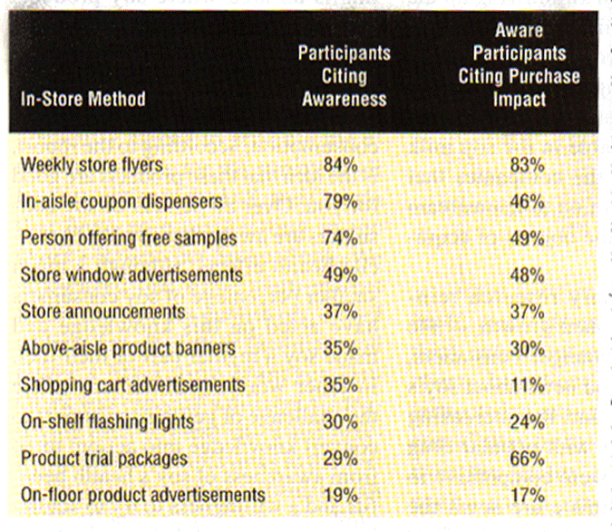 Participants indicated weekly store Weekly store flyers produced the highest level of awareness and translate into greatest level of sales, followed by in-aisle coupon dispensers and individuals offering free samples (results for other methods are shown in chart).