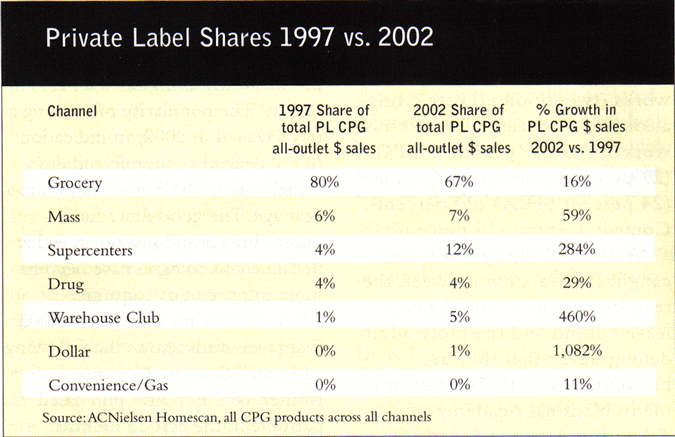 From 1997 to 2002, private label products had a 38 percent dollar volume growth rate, while branded products experienced a 19 percent growth rate.
