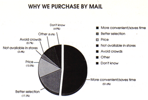 Over half of those who shop by mail said the reason they did so is because it saves time or is more convenient. Another 17% said they were able to obtain a better selection of merchandise. Fourteen percent told interviewers they use mail order because of better prices. Only 1% of respondents said they shop by mail to avoid crowds. Almost twice as many men as women listed price as a reason they order by mail; conversely, more women than men said they use mail order because of convenience.