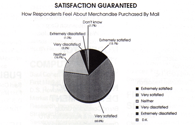 Apparently, most people who shop by mail are happy with their purchases. An overwhelming 77% said they were extremely or very satisfied with their purchases. Seventeen percent were neither satisfied nor dissatisfied. Only 5% of consumers were very or extremely dissatisfied with their orders.