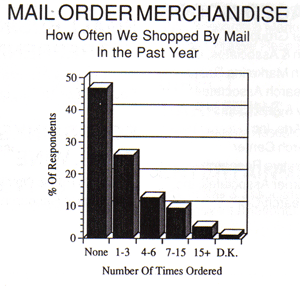 A Maritz AmeriPoll found that 52% of the respondents ordered merchandise by mail at least once in the past year. 25% said they shopped by mail 1-3 times, 13% said 4-6 times, and 10% said 7-15 times. Four percent of respondents averaged over an order per month, shopping by mail more than 15 times in the past year.