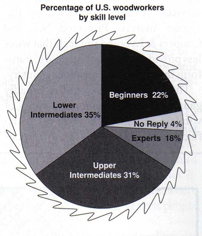 Most woodworkers are at an intermediate skill level. About one in four consider themselves beginners, and 8% consider themselves advanced or expert.