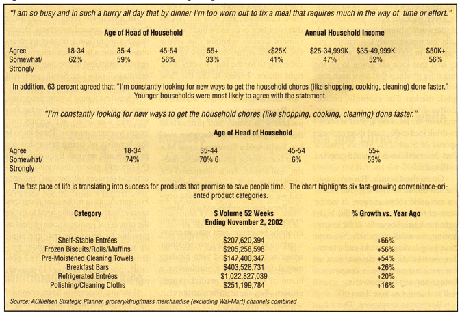 "Several CPG manufacturers are successfully serving today’s timestarved consumer," says Phil Lempert, a food industry expert and spokesperson for the ACNielsen Consumer Pre*View service. "However, many retailers are still trying to figure out how to do so: The challenge of providing a freshly prepared great-tasting meal at a reasonable price and with a maximum of convenience has yet to be solved. For those who come up with a good solution, there’s tremendous upside potential. I don’t see consumers slowing down anytime soon, and meal preparation is a key area where consumers are looking to save time."