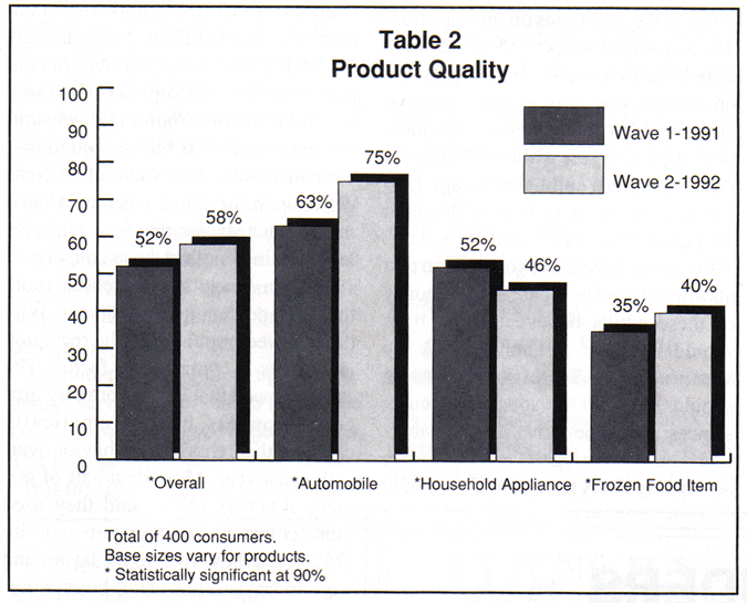 Fifty-eight percent of consumers perceive an improvement in product quality, which is a significant increase over last year's 52%. Among people who recently purchased a new American-made automobile, 75% believe American-made automobiles have improved over the last three years, much greater than the 63% in 1991. Maginnis says this strong positive response may be attributed to the many quality programs undertaken by several automobile manufacturers during this time period. A significant increase in perceived quality also exists among consumers who purchased frozen food items, which rose from 35% to 40%.