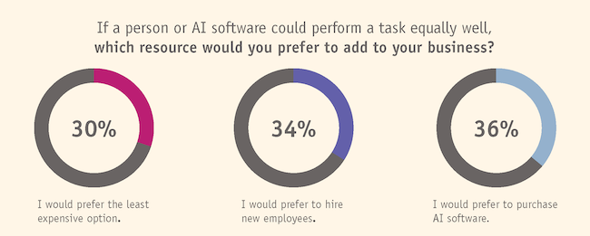 When asked if they needed to add a new resource to their business, and either a person or AI software could perform the task equally well, small business owners were evenly divided with 36% preferring to purchase AI software, 34% preferring to hire a new employee and 30% saying they would choose the least expensive option. AI usage increases along with the size of the business. Forty-seven percent of businesses with 10+ employees use AI, 40% of businesses with five to nine employees use AI and 27% of businesses with one to four employees use AI.