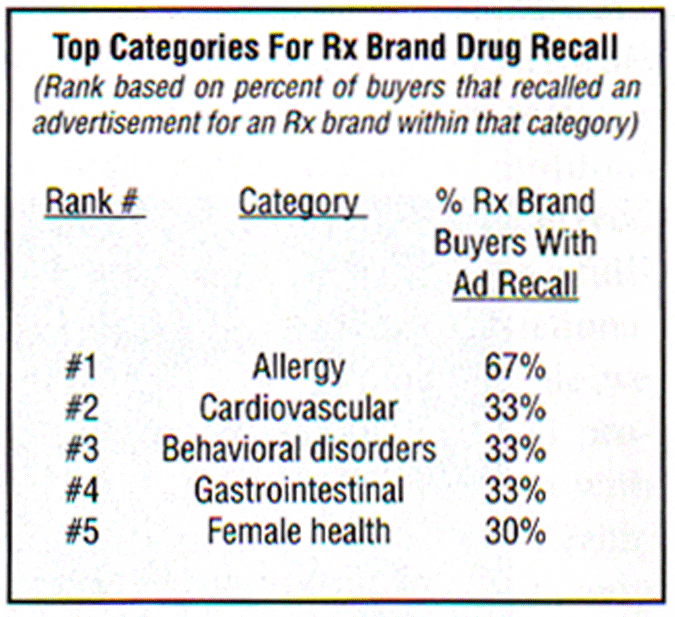 Certain categories have higher ad recall among consumers. Nearly three-quarters of the patients on a Rx allergy medication recalled an advertisement for their drug. The top-ranking categories for ad recall levels are shown in the accompanying table.