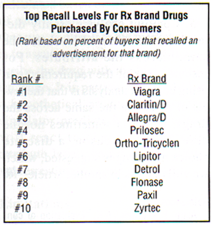 Consumers who purchase Rx drugs as part of their treatment regimens report high levels of ad recall for that Rx medication. For example, Viagra tops the list for ad recall among buying consumers. Ninety-two percent of the consumers who purchased Viagra recalled seeing an ad for the brand.