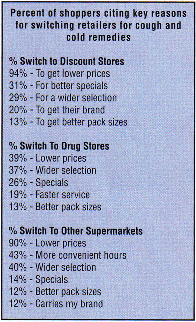 Not surprisingly, price is the most frequent reason that supermarket shoppers switch to discount stores for cough and cold remedies. A whopping 94 percent of switchers to discount stores cite price as a reason for switching, compared to 29 percent who say wider selection motivates them to switch to discount stores. By contrast, shoppers who switch to drug stores to buy cough and cold remedies are half as likely to consider pricing issues (39 percent) as switchers to discount stores - making wider selection as important as pricing.