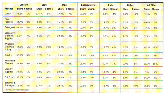 Most of the product groups in the chart generate over $1 billion in annual all-outlet sales, so even small share changes are significant. For example, paper products is a more than $16 billion product group. When the dollar store channel grew its share from 3.1 percent in 2002 to 3.6 percent in 2003 - a 16 percent gain - it captured nearly $809 million in new revenue. For more information visit www.acnielsen.com.