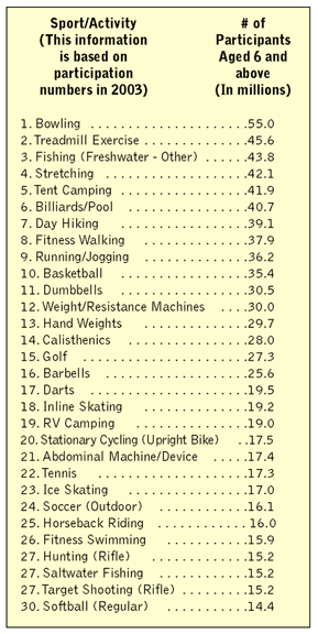 Fitness is king once again - as 12 of the top 30 sport/activity categories are fitness related. That’s the conclusion of SGMA International’s analysis of the Sports Participation Topline Report. SGMA International is the global business trade association of manufacturers, retailers and marketers in the sports products industry. Listed are the top 30 sports activities and recreational endeavors in the United States, based on participation in 2003.