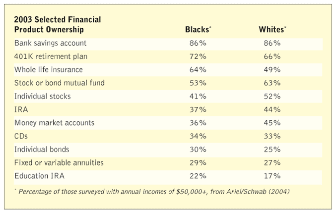 - Although the net worth of blacks is increasing, they have less money in long-term investments compared to whites with similar incomes, primarily due to lack of knowledge.