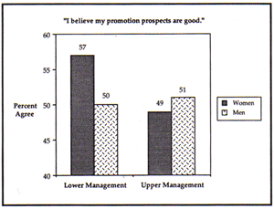 An active hypothesis in American business holds that women unable to move into upper management will be less positive towards such things as promotion opportunities and performance evaluation. Indeed, ISR found that: