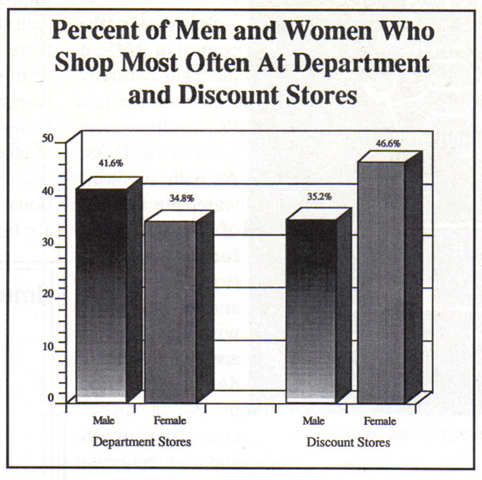 When asked which stores they would shop most often for holiday gifts, a Maritz Marketing Research study reveals that department stores are favored more by men, while women prefer discount stores. Forty-two percent of males use department stores more often. In contrast, 47% of women choose discount stores over department stores. Men rank discount stores second. For study purposes, department stores are defined as retailers like Sears, JC Penney, May Company, and Nordstrom. Wal-Mart, K-Mart, and Target are considered discount stores. The study also shows the higher your income, the more likely you are to shop at department stores for holiday gifts. Over half (51%) of those with incomes of $45,000 or more planned to shop most often at department stores, compared to 34% of those with incomes under $45,000. Nearly half (48%) of the last group would shop most often at discount stores.