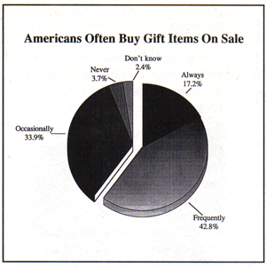 The number of people always shopping sales declines steadily with increased income. For example, 23% of those with incomes under $25,000 always shop sales. That number decreases to 9% of those with incomes of $55,000 or more. The study also suggests women are more likely to buy sale items than men. Twenty-two percent of females always purchase gift items on sale; only 12% of men do so.