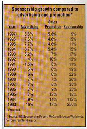 Although sluggish in comparison to previous years, sponsorship’s projected gowth continues to surpass the outlooks for advertising and sales promotion. McCann-Erickson Worldwide anticipates a 5.6 percent rise in ad spending for 1997, while Veronis, Suhier & Assoforecast projects a 5.6 percent rise in sales promotion expenditures for 1997.