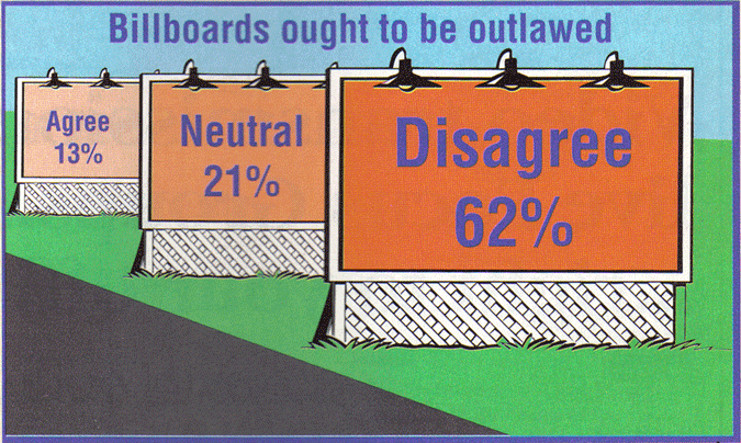 It could be the sheer utilitarian function of many billboards (how many miles to the nearest restaurant, hotel, gas station, etc.) that tempers Americans’ distaste for roadside sig-ns. Most favor a balance between wanton proliferation and strict regulation. When asked to respond to the statement, "Billboards can be useful, but should be strictly regulated," 52 percent a~ee, 20 percent disagree, and 26 percent are neutral. Men appear to be a little soft on the subject, with just one-fourth strongly ageeing with the notion of strict regulation (compared to 34 percent of women), while 17 percent feel strongly that billboards should not be regulated (compared to less than 10 percent of women).