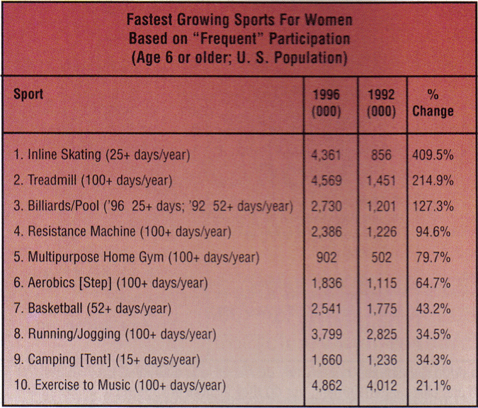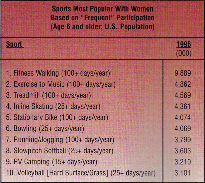 According to a recent sports participation study by the Sporting Goods Manufacturers Association (SGMA), women are actively involved in a wide range of endeavors - especia!ly fitness activities (see tables).