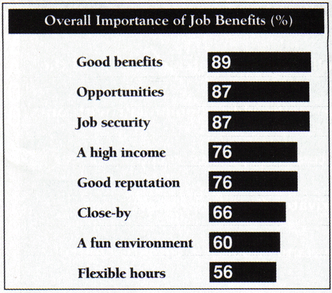 "Good health and other employee benefits" ranked number one among eight job-related benefits evaluated by 300 Hispanic adults interviewed by MDI in the five major Hispanic markets." For U.S. and foreign-born Hispanics alike, "opportunities for advancement" and "job security" came next in importance, well above "high income."