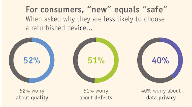 Many associate “new” with “safe.” When asked why they are less likely to choose a refurbished device, 52% worry about quality, 51% worry about defects and 40% worry about data privacy.